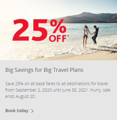 Save 25% on all Economy, Premium Economy and Business Class base fares to all destinations for travel from September 2, 2020 until June 30, 2021.