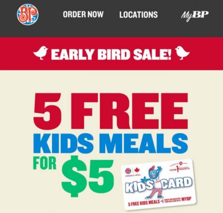 A $5 donation gets you 5 FREE Kids Meals! Buy your digital Kids Card one week early from August 18-23, 2020. As a bonus, get one (1) extra FREE Kids Meal when you register your card with MyBP. Kids Cards can be redeemed for dine-in only.