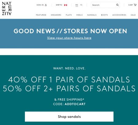 Naturalizer.ca: 40% Off 1 Pair of Sandals, 50% Off 2+ Pairs of Sandals Promo Code + Free Shipping (Aug 2-12)