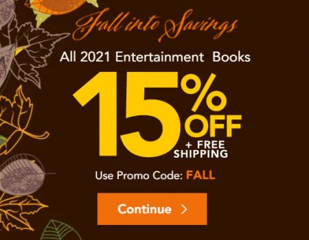 For a limited time, Entertainment.com is offering 15% off all 2021 Coupon Books + Free Shipping when you enter Promo Code FALL at checkout.