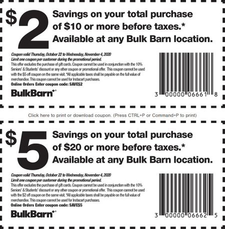 Click here to print Bulk Barn’s $2 and $5 off coupon.
