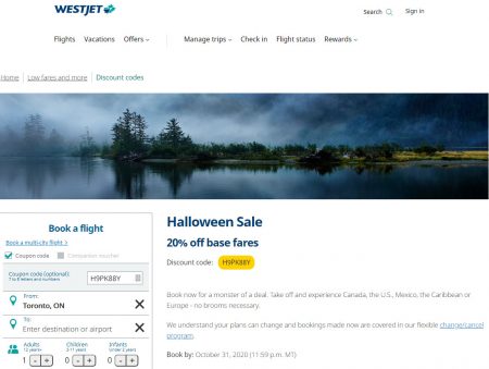 WestJet: Halloween Sale - 20% Off Base Fares Discount Code (Book by Oct 31)