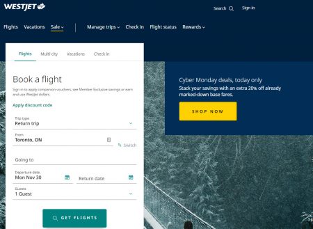 WestJet: Cyber Monday Deals - Extra 20% Off Discount Code (Nov 30)