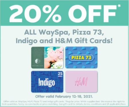 Rexall: 20% Off Indigo, H&M, Pizza 73, and WaySpa Gift Cards (Feb 12-18)