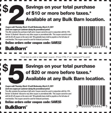 Click here to print Bulk Barn’s $2 and $5 off coupon.