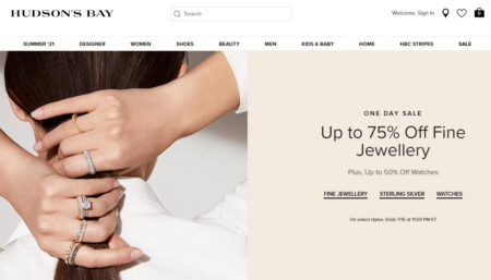 Hudson’s Bay: One Day Sale – Up to 75% Off Fine Jewellery, Up to 50% Off Watches (July 15)