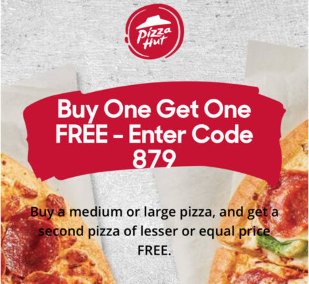 Buy a medium or large pizza and get a medium or large of equal or lesser value for free when you enter code 879 at checkout. This offer is not valid with any other promotion or offer.