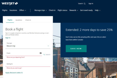WestJet: Save 25% Off Within Canada Discount Code (Book by Aug 12)