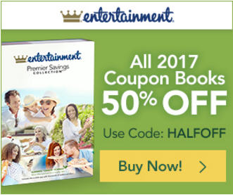 Save 50% Off + Free Shipping on all 2017 Entertainment Coupon Books when you enter the promo code HALFOFF at checkout.