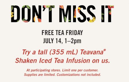 Visit your local Starbucks store on Friday, July 14, 2017 between 1-2pm and get a FREE tall (355mL) Teavana Shaken Iced Tea!