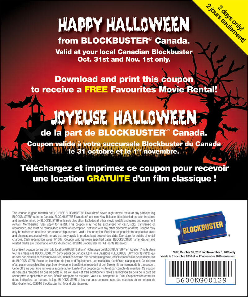 The deal is valid for 2 days only (October 31 - November 1, 2010). It sucks that it doesn’t include new releases but you can use the coupon to rent some classic horror movies to watch on Halloween.
