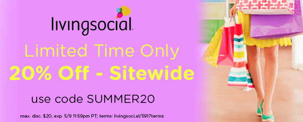 - Take 20% off your next purchase for almost any deal on LivingSocial.com when you use promo code “SUMMER20”.