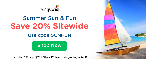 - Take 20% off your next purchase for almost any deal on LivingSocial.com when you use promo code “SUNFUN”.