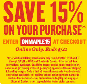 For two days only, May 20 and 21, 2011, Old Navy is offering 15% off your purchase when you shop online. Simply enter the promo code ONMAPLE15 at checkout to receive the discount. Plus for any order over $50, shipping is free. Some additional conditions apply.