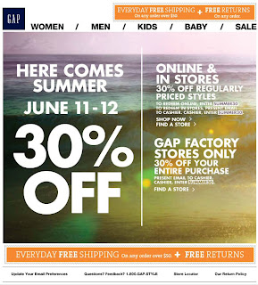Gap has a great sale right now! Take advantage of Gap’s Summer sale and get 30% off regularly priced styles! This is a 2-day only sale that ends tonight (June 12, 2011) and is available online and in all Gap & Gap Factory stores across Canada.